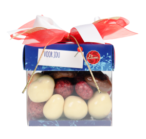 Een heerlijke mix van aardbeien met witte chocolade, bosbessen met witte chocolade en bosbessenpoeder en honingbanaantjes met melkchocolade in een luxe ingepakt doosje. Daar eet je natuurlijk bijna je vingers bij op! In elk cadeaupakket zit zo’n lekker doosje vol gechocolateerd fruit van Elvee.
